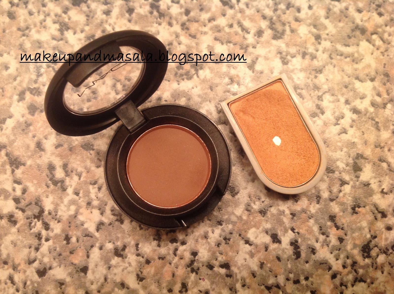 (MAC's Swiss Chocolate, Mary Kay's Goldenrod plus swatches (left is Swiss Chocolate))